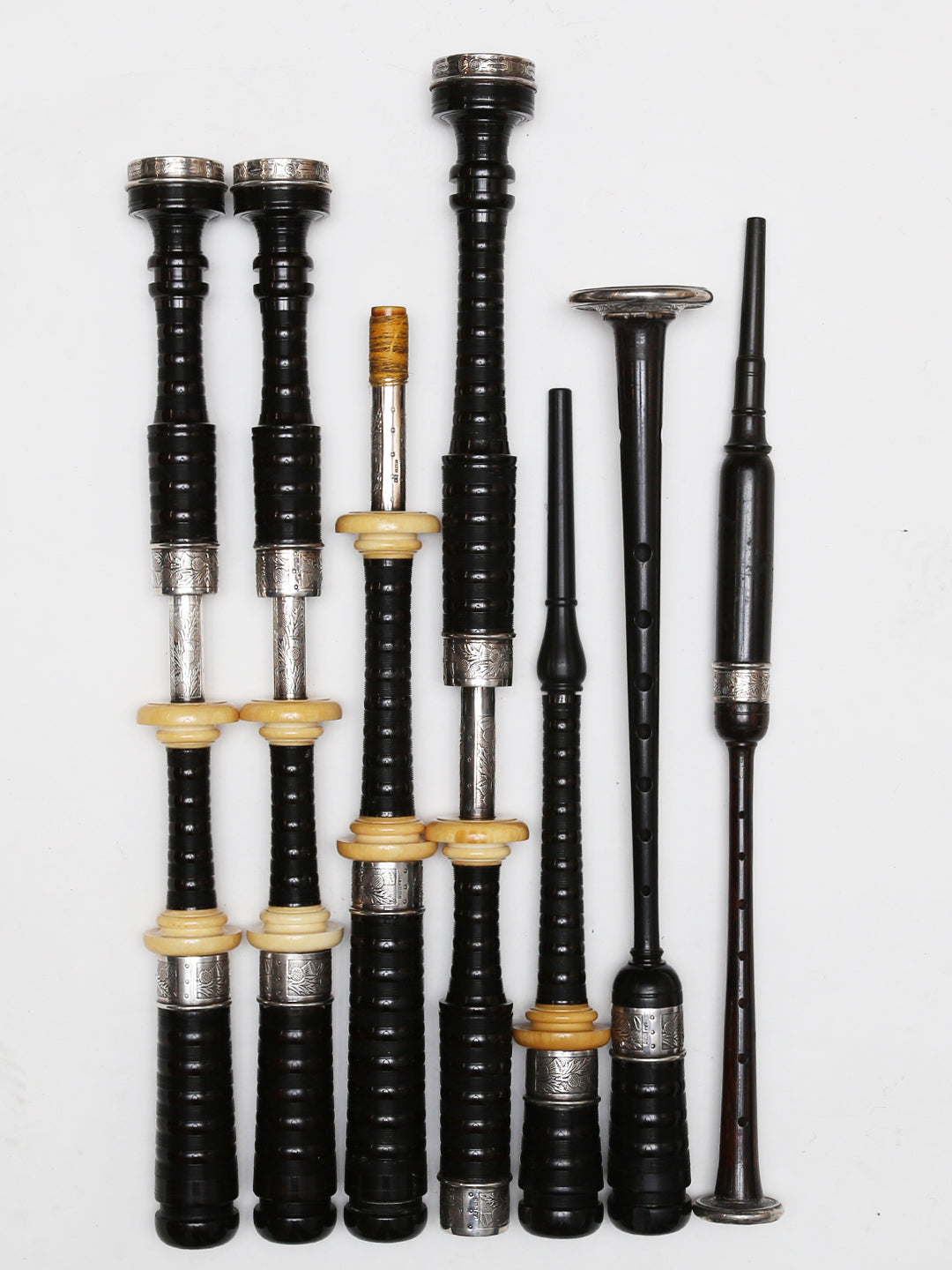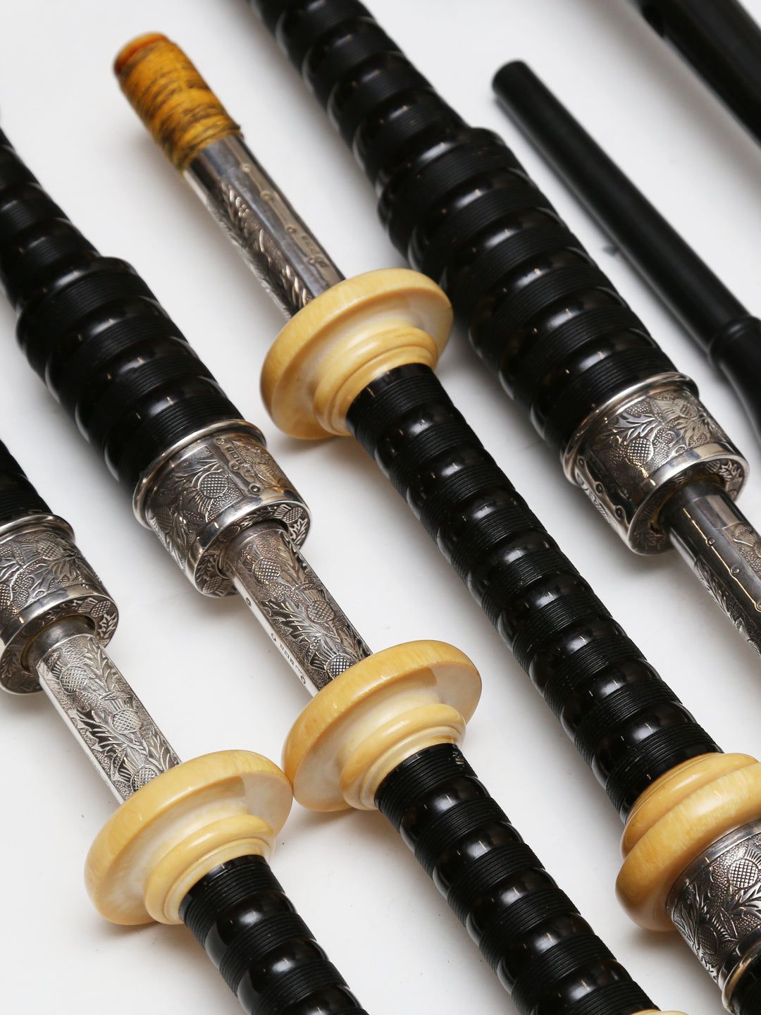 • This set is in excellent condition.  It is made of African Blackwood. The ferrules, slides, and ring caps are made of thistle engraved silver.  The projecting mounts are made of ivory.  Blowpipe is cracked at the bottom (Little Mac Pressure)